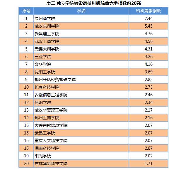 课题组从论文、课题、奖励、发明专利等四个维度对独立学院转设高校的科研情况进行评价。课题组设置了12项具体的测量指标:英文三大检索论文(SCI、SSCI、A&HI)、CSSCI论文、CSCD论文、国家社会科学基金项目、国家自然科学基金项目、教育部人文社科项目、国家自然科学奖、国家技术发明奖、国家科学技术进步奖、高等学校科学研究优秀成果奖(科学技术)、高等学校科学研究优秀成果奖(人文社会科学)、授权发明专利。论文、课题、奖励、发明专利的权重分别是50%、25%、10%和15%。各种统计指标的数据来源,均来自权威的官方网站或者数据库。通过运用线性指标计算法和非线性指标计算法进行计算后,得到独立学院转设高校科研综合竞争指数。独立学院转设高校科研综合竞争指数前20强见下表二。由于浙江大学城市学院等3所独立学院的转设正在公示中,所以下表不包括上述三所高校。