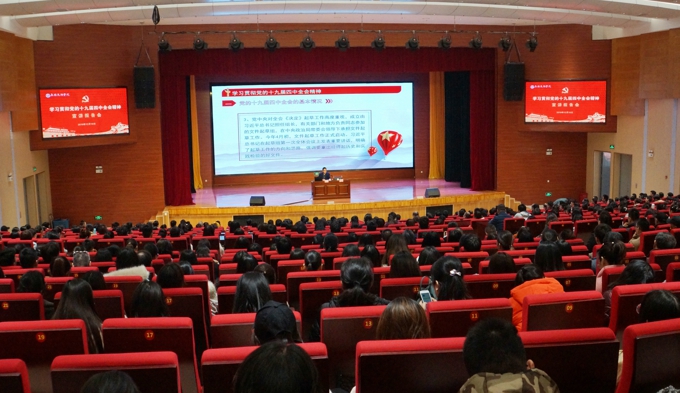 金秋萍书记在主持报告会时指出,全校教职工、学生党员和入党积极分子要以本次宣讲报告会的举行为契机,在全校迅速掀起学习宣传贯彻党的十九届四中全会的热潮,要在深入学习中领会精神实质,系统领会新思想、深刻理解新观点、准确把握新要求,党员领导干部要以身作则、以上率下,先学一步、学深一层,更好推动学校各项事业发展;要在广泛宣传中凝聚发展共识,各二级学院、各部门要把宣传全会精神摆在重要位置,通过喜闻乐见的方式,开展宣传宣讲工作,推动学习贯彻全覆盖,确保全会精神入脑入心;要在结合实际中全面贯彻落实,把全会精神的学习作为理论学习中心组学习和“不忘初心、牢记使命”主题教育的重要内容,把准确把握中国特色社会主义制度和国家治理体系的科学内涵、本质特征和显著优势,与推动学校进一步落实立德树人根本任务,践行为党育人、为国育才光荣使命,加快建设特色鲜明、国内一流的应用型本科大学很好结合起来,在推动实际工作中把全会精神贯彻好、落实好。