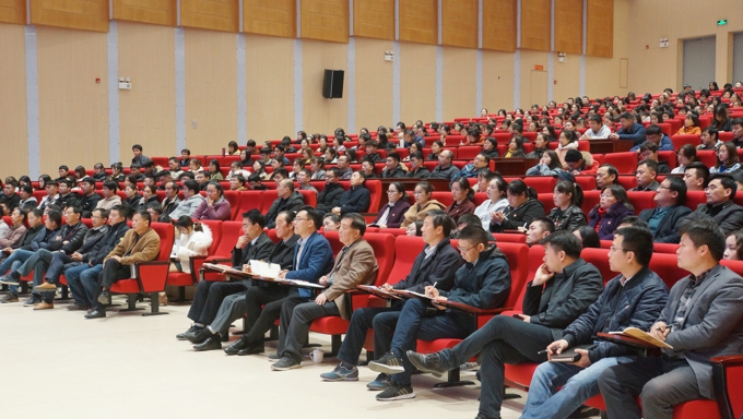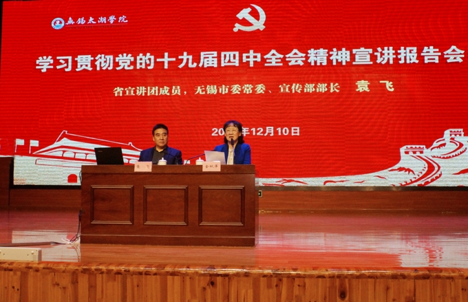本网讯 12月10日下午,best365举行党的十九届四中全会精神宣讲报告会。江苏省委宣讲团成员、无锡市委常委、宣传部长袁飞作宣讲报告。学校理事长、党委书记金秋萍主持报告会。校长、党委副书记徐从才,常务副校长李廉水,以及其他校领导班子,校党委委员,全校教职工、学生党员和入党积极分子等800多人参加报告会。