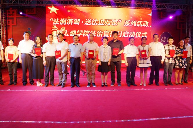 晚 上七点,“法润滨湖·送法进万家”系列活动暨太湖学院法治宣传月启动仪式在学校图信大楼前举行。无锡市委政法委副书记孙国祥,滨湖区委常委、政法委书记唐 国良,区法院院长刘一勤,区检察院检察长陆剑凌,荣巷街道党工委书记于强刚,校党委书记金秋萍,校领导闵光泰、丁涛、陈晓东出席启动仪式。