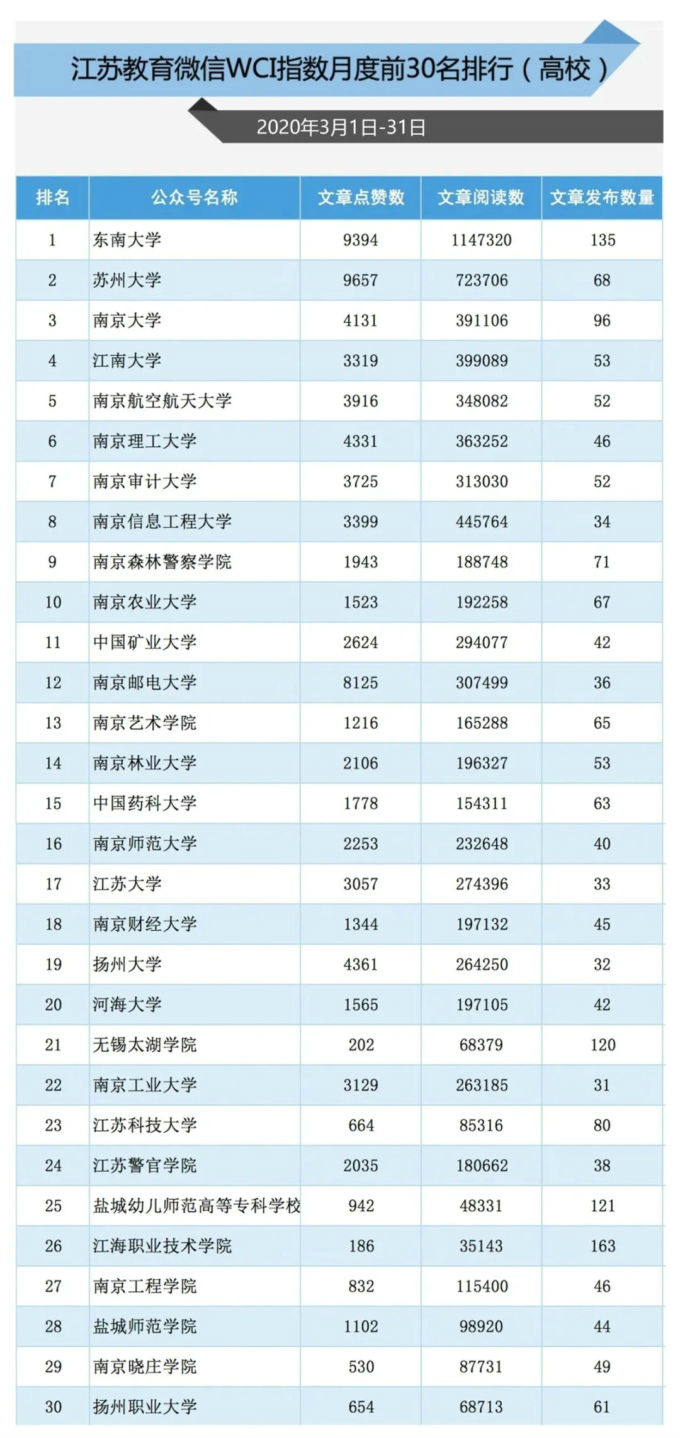 4月16日,江苏省教育厅官方微信发布了3月份江苏高校微信WCI指数月度前30名,在排行榜中,best365英国在线体育官网位列第21名,居江苏省同类高校榜首。