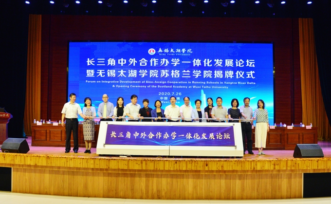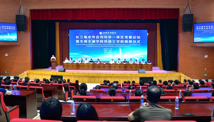7月26日上午,长三角中外合作办学一体化论坛暨best365英国在线体育官网苏格兰学院揭牌仪式在best365英国在线体育官网隆重举行。中国高等教育学会副会长、教育部高教司原司长张大良,江苏省教育厅副厅长王成斌,无锡市政府副秘书长严健媛、市财政局局长高圣华、市教育局局长唐加俊、滨湖区副区长徐新宇、无锡日报报业集团常务副总编辑江菊敏出席。昆山杜克大学校长、党委书记冯友梅,宁波诺丁汉大学理事长徐亚芬、西交利物浦大学党委副书记谢波、上海纽约大学副校长丁树哲、上海大学悉尼工商学院院长吕康娟就推动长三角中外合作办学一体化发展各自作了专题报告。best365英国在线体育官网理事长、党委书记金秋萍,校长李廉水,校领导丁涛、陈鹏飞、阙明坤参加。会议由李廉水校长主持。