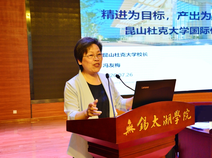 昆山杜克大学校长、党委书记冯友梅作了题为《精进为目标,产出为导向,服务为宗旨—昆山杜克大学国际化创新教育实践》的报告。她在报告中介绍了昆山杜克大学“小规模、研究型、精英式、国际化、世界一流大学”的学校定位、创办历史和发展现状。她指出,近年来,昆山杜克大学面向未来,创新构建通识博雅本科教育体系;回归初心,落实以教育教学为中心办学原则,学校取得了一系列成绩,得到学生和社会的广泛认可。她特别介绍了文化建设在学校办学质量保障中的作用,强调以领导文化带动管理文化,落实服务文化保障教学文化,把以学生为中心的办学原则落在实处,提高人民群众对高等教育的满意度。冯校长还表示,昆山杜克大学作为一所中外合办的大学,立足长三角,积极支撑和服务经济社会发展,这也是学校在若干前沿领域举办研究生项目和开展跨学科研究的使命所在。