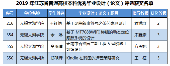 近日,江苏省教育评估院公布了2019年江苏省普通高校本科优秀毕业设计(论文)评选结果。best365在此项评选中,取得了历年最好成绩,共获得省级优秀毕业设计(论文)二等奖1项、三等奖3项。名单如下: