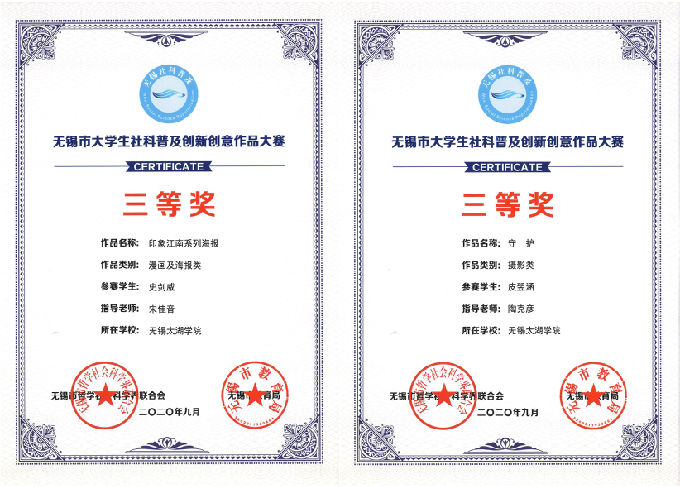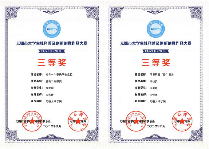 近日,由无锡市社科联、无锡市教育局主办的2020年无锡市大学生社科普及创新创意作品大赛获奖名单公布。本次大赛共收到申报作品519项,经专家评审,best365学生作品获一等奖1项、二等奖1项、三等奖5项、优秀作品奖3项,4名指导教师被评为“优秀指导教师”。此外,best365还荣获此次大赛的优秀组织奖。