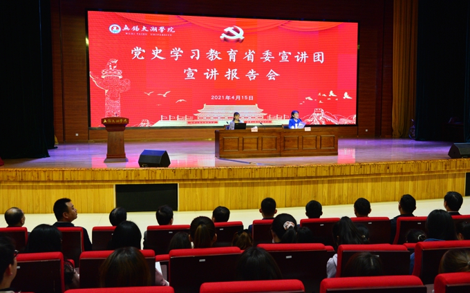 党委书记金秋萍在总结讲话中就学校进一步深入开展党史学习教育、扎实推进各项工作提出了明确要求。她指出,开展党史学习教育是我党政治生活中的一件大事,是学校全年工作的一项重大政治任务。全校各级党组织要以强化政治担当,以此次省委宣讲团来校宣讲为契机,在全校迅速掀起党史学习教育的热潮。她要求,一是要突出政治引领,要认真学习贯彻习近平总书记在党史教育动员大会上的重要讲话精神,全面领会讲话内容和精神实质,切实把思想和行动统一到总书记的重要讲话精神上来,推动党史学习教育在太湖学院落地生根;二是要注重实际效果,坚持优良学风,创新学习方式,坚持规定动作和自选动作相结合,贴近实际开展学习教育;把党史学习教育开展情况纳入校党建工作考核,纳入各级领导班子和领导干部年度考核;对全校教师、职工以及二级学院开展全面考核,要实行优胜劣汰,引进一批真正高水平的博士、教授和政治责任心强、素养高,真正具有发展潜力的年轻教职工;三是要坚持统筹推进,每一位教职工、每一个师生党员增强紧迫感和危机感,增强主人翁责任心,进一步发扬“四千四万”精神,建好国家和省级一流专业和一流课程,建好六大专业群,建好5个硕士点,为建成特色鲜明、高质量的大学——太湖大学做出更大贡献。