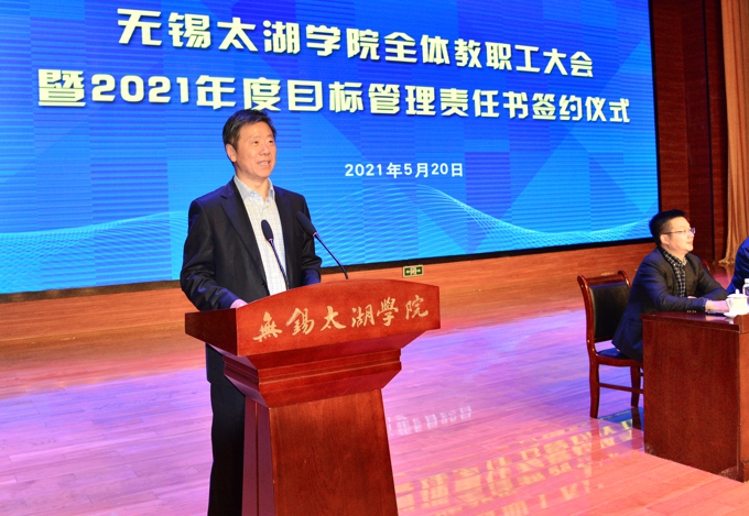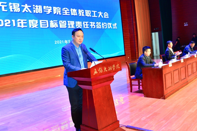 李廉水校长对此次受表彰和奖励的优秀二级学院和优秀职能部门表示了祝贺,并向此次参与目标考核管理的教职工致以敬意。他指出,开展目标管理的核心在于让每个人明确定位,在日常工作中做到有方向、有路径、有思路,在有限的资源和条件下实现效益的最大化。2020年,学校各项成绩显著。一是切实强化顶层设计,不断提升大学治理效能,通过民主协商形成目标管理体系,高质量编制了学校“十四五”规划纲要。二是深化人才培养模式改革,不断提高人才培养质量,财务管理、国际经济与贸易、旅游管理、英语、土木工程、计算机科学与技术、电子信息工程、数字媒体艺术等8个专业入选省级一流专业建设点,入选数居全省和全国同类高校第一,“品牌形象设计”“创新创业实践”2门课程成功入选国家一流本科课程,新增设了软件工程、机器人工程两个专业,新申报了跨境电子商务、人工智能、智能制造、康复治疗学等四个专业;成功创建了苏格兰学院。三是努力提高科学研究水平,增强了学校核心竞争力,设立科研月报制度,定期召开科研月报指标分析会,全年获批科研项目在2019年基础上增加了75%,创办了《best365英国在线体育官网学报》,进一步营造了学术研究的氛围。四是加强师资队伍建设力度,提高教师整体水平,健全师德师风建设长效机制,2020年开展师德典型评比,评选出20名师德标兵;优化了新教师引进标准,增补了校聘教授和副教授的评审办法,促进了存量优化;推进学历提升和调整淘汰工作,同时,对全校教师以及二级学院的教学科研工作进行全面考核和调研,并在此基础上实施末位淘汰制;持续优化“双师”评选认定。五是创新校企协同育人机制,构建产教融合新格局,与无锡市商务局等共建中国(无锡)跨境电商学院;主动融入地方经济社会发展,学校新增21家实体性校企合作基地;新增教育部协同育人项目15个;案例入选中国高等教育学会“校企合作双百计划”优秀案例,并被推荐参加长沙高博会展览展示。六是牢固树立“学生中心”意识,创新学生工作机制,加强学生思想政治教育。2020年,学校开办了学生干部培训班,组织开展了校院两级学生的思想教育,完成了学生德智体综合素质测评工作;组织学生参加无锡马拉松、第二届运河博览会志愿服务等,疫情期间,引导志愿者主动投入基层防疫工作,荣获省市级“抗疫先进”奖项共计27项。此外,招生就业工作、校友联络工作和校园文化建设均取得新的成效。