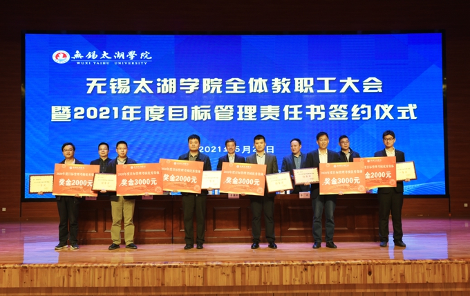会上,副校长金成宣读了《关于表彰2020年度目标管理考核优秀集体的决定》,校领导为在2020年度目标管理考核中成绩优秀的集体颁发了表彰证书、发放了奖励,艺术学院、物联网工程学院等优秀二级学院,教务处、学工处、学校办公室、科技处、党委宣传部、保卫处等优秀职能部门负责人上台领奖。校长李廉水代表学校分别与物联网工程学院、智能装备工程学院、会计学院、智能建造学院、商学院、外国语学院、艺术学院、健康与护理学院等二级学院现场签订了2021年度目标管理责任书。
