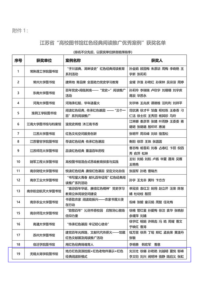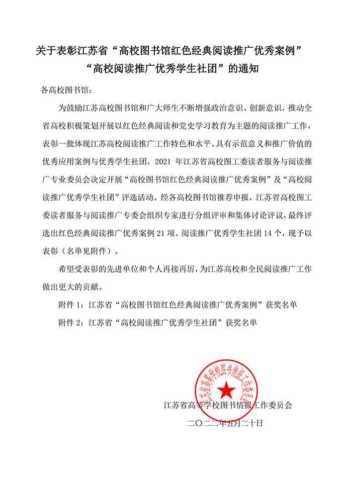 此次活动由江苏省高校图工委读者服务与阅读推广专委会组织专家进行分组评审和集体讨论评议,最终评选出红色经典阅读推广优秀案例21项、阅读推广优秀学生社团14个。