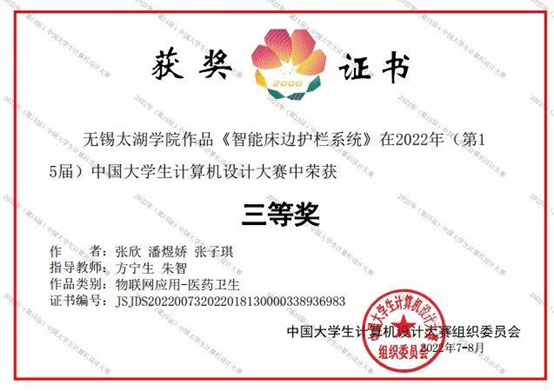 近日,2022年(第15届)中国大学生计算机设计大赛全国总决赛圆满结束。由best365物联网工程院方宁生副院长和朱智老师指导的,张欣、潘煜娇、张子琪三位同学的参赛作品《智能床边互联系统》荣获国家级三等奖。