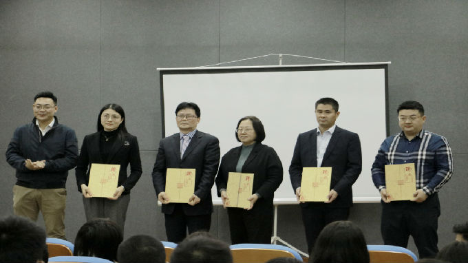 紧接着,由主持人向同学们较为详细的介绍了海辉事务所的名誉主任焦克、名誉主任王跃新、资深律师李克章、资深律师张苗、资深律师毕俊个人简历,副校长陈鹏飞为受聘的5位法学系客座教授颁发聘书。外国语学院院长肖辉为江苏海辉律师事务所校园法律专委会代表王诏炜律师颁发聘书。