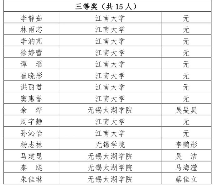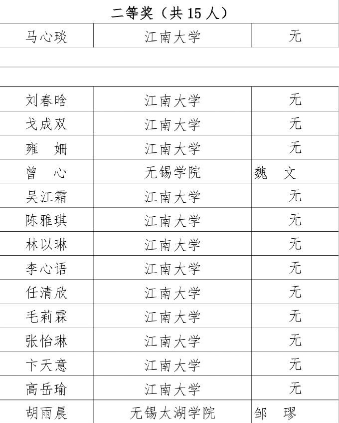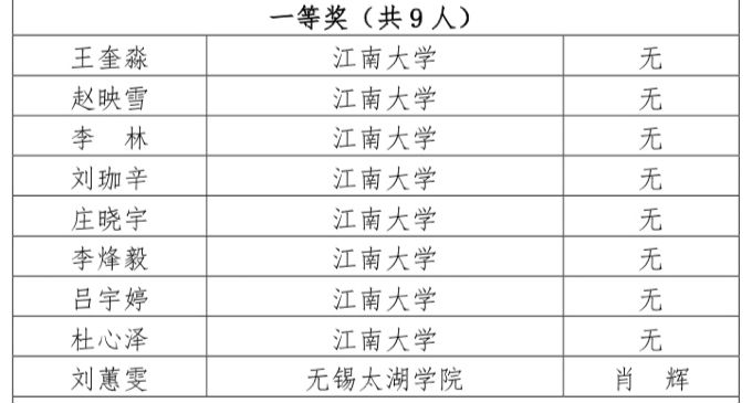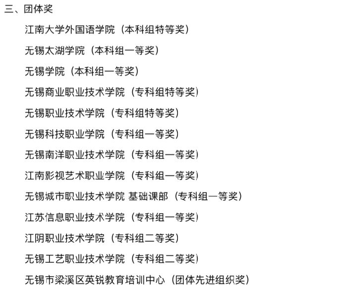 其中,在无锡市第十六届英语翻译比赛中,刘蕙雯同学获得“本科组一等奖”,胡雨晨同学获得“本科组二等奖”,余烨同学、马建昆同学、秦聪同学、朱佳琳同学获得“本科组三等奖”。