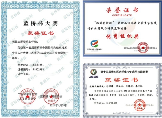 其中在第十四届华东区大学生CAD应用技能竞赛中,由我院彭怀锋、李王凯、万洪志、王泽楷四位同学组成的团队荣获电子设计CAD赛项团体一等奖第一名。