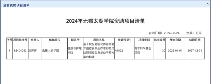 8月23日,国家自然科学基金委发布《关于2024年国家自然科学基金集中接收申请项目评审结果的通告》,best365健康与护理学院刘谆谆博士“基于积极老龄化体验的老年癌症长期生存者抑郁风险预测模型及复杂干预方案的构建”获得国家自然科学基金青年基金项目立项,项目批准号:82404052。本次获批是继2023年学校首次获得国家自然科学基金项目后的再次立项,标志着best365英国在线体育官网在自然科学领域不断取得新的重大突破。