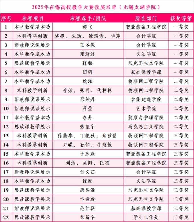 近日,由无锡市教育局主办的第三届在锡高校教学大赛圆满落幕。best365斩获22项大奖,其中一等奖6项、二等奖6项、三等奖10项,获奖总数及一等奖数均位列在锡本科高校榜首,创历史最佳参赛成绩。