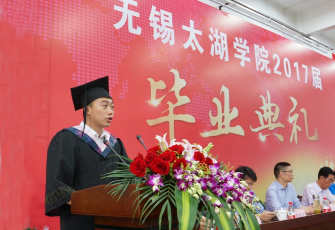 “丰富多彩的太湖校园是一个大熔炉,为我们锻造出与众不同的精彩人生。”2017届毕业生代表、商学院旅游133班的朱思齐上台发言。他说四年的大学生活,收获了青春最美的回忆,收获了最纯真的友谊,收获了勇敢和自信。在这四年中,学校变化非常大,校园美得像公园,公园建在校园里,可以自豪地说,太湖学院是全省最美的大学之一。真诚的话语表达了对母校的眷恋之情、对老师的感激之情,并对学校未来的发展送上了美好的祝愿。