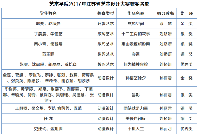 2017年5月12日江苏省工艺美术学会设计专业委员会发起关于举办“2017年江苏省艺术设计大赛”的通知。我院数媒、环艺专业师生积极报名投稿,取得了优异的成绩。本次省级大赛共10件作品获奖,其中环境艺术金奖1名,数码艺术银奖2名、铜奖1名、优秀奖1名,动漫设计金奖1名、银奖1名、铜奖2名、优秀奖1名。