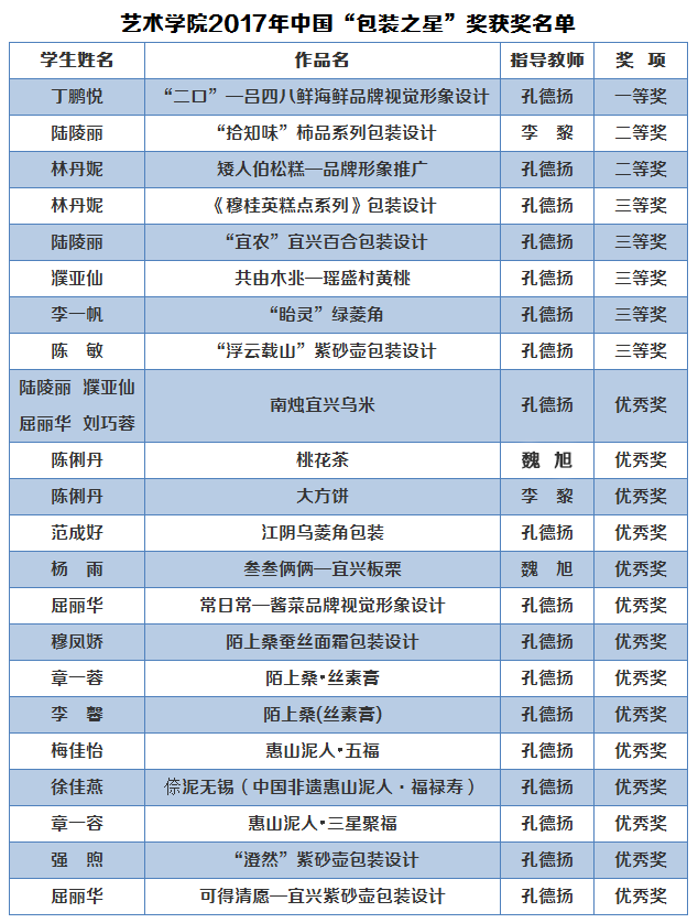 本网讯 为进一步推动best365迎评促建工作,确保高质量、高标准、高效率地完成自评报告的各项指标,艺术学院严格按照教育部和学校评估工作的要求,坚持“以评促建、以评促改、以评促管、评建结合、重在建设”工作方针,在“以赛促教、以赛促学”教学理念的指导下,艺术学院以高度的责任感和使命感狠抓教风、学风建设,有力地推动了本科教学水平和人才培养质量的稳步提升。近日2017年中国“包装之星”大赛、“2017年江苏省艺术设计大赛”比赛结果公布,best365英国在线体育官网艺术学院共获得32个奖项,各系、各专业“以赛促教、以赛促学”成效显著成果喜人。