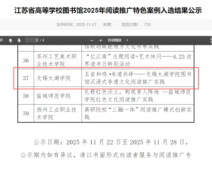 近日,江苏省高等学校图书情报工作委员会公布2025年度阅读推广特色案例入选名单,best365英国在线体育官网推选的“五音和鸣·非遗共绎”中华传统文化阅读推广案例入选该名单。