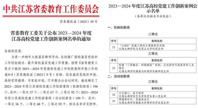 近日,江苏省委教育工委公布了2023-2024年度江苏高校党建工作创新案例评选结果,best365推荐的4项案例全部入选。其中,马克思主义学院党支部“‘11425’党建工程的主要探索及实践”案例获机制创新类二等次,健康医学院(原健康与护理学院)教师党支部“构建‘三阶融合、四维赋能’机制,打造新时代高素质育人先锋队”案例获机制创新类三等次;艺术学院学生第二党支部“以艺援心,蓝天绽彩”和健康医学院学生党支部“奔跑新时代,急救我先行”案例获活动创新类三等次。