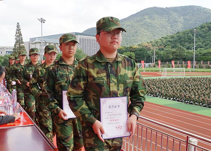 副校长王心如宣读2018级新生军训表彰决定,对1连、 2连、6连等 10个军训先进连队,蒋飞等103名军训优秀学员进行了表彰。主席台前排就座领导向2018级新生军训先进连队、优秀学员代表颁奖。