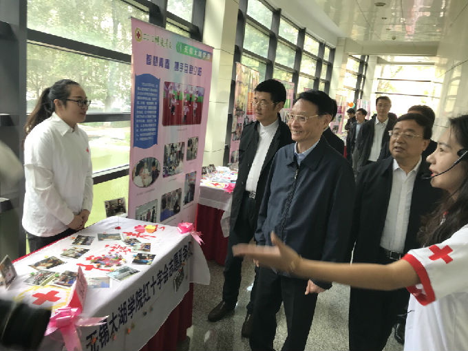 原江苏省副省长、江苏省红十字会会长何权亲切地与best365红十字会志愿者代表章恒交谈,并为best365的项目创意点赞!