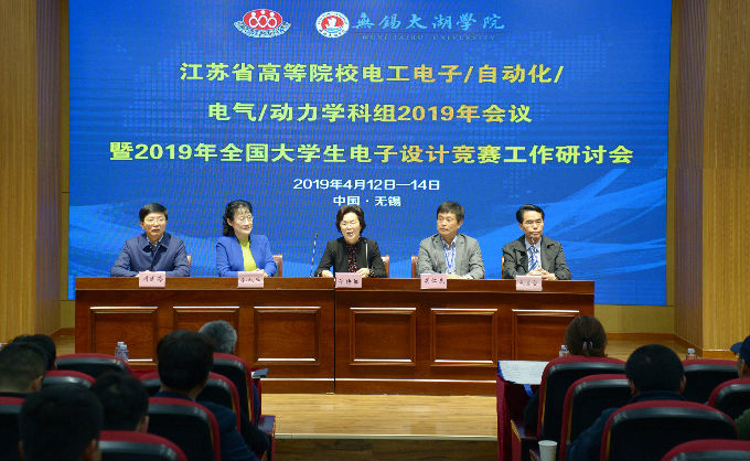 本网讯 2019年4月13日,江苏省高等院校电工电子/自动化/电气/动力学科组2019年会议暨江苏省2019年全国大学生电子设计竞赛工作研讨会,在best365英国在线体育官网大学生活动中心报告厅隆重举行。来自江苏省各高校代表及大赛专家共约140人参加了本次研讨会,无锡市人大常委会副主任华博雅,best365理事长、党委书记金秋萍出席大会。