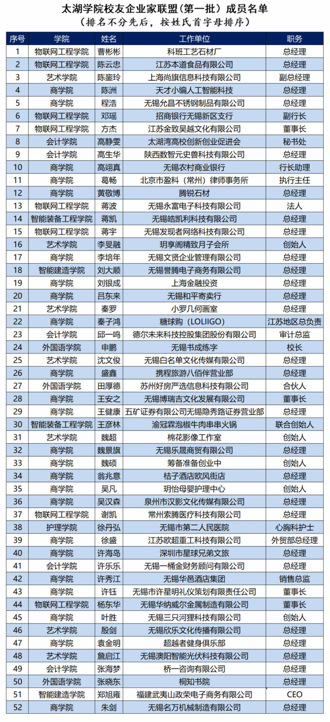 经二级学院推荐和校友自主申报,同意五矿证券有限公司无锡隐秀路证券营业部总经理王健康、陕西数智元史兽科技有限公司总经理高生华、招商银行无锡新区支行副行长邓瑶、深圳市星球兄弟文旅总经理许海岛、无锡华纳威尔金属制造有限公司董事长杨东华等52名校友为太湖学院校友企业家联盟第一批成员。希望联盟充分发挥好引领示范的“旗帜”作用、学校与校友之间沟通互动的“桥梁”作用、学校优秀办学声誉的“名片”作用,使联盟成为激励和引导在校大学生立志成才的重要示范群体,成为广大校友的精神家园,成为推进太湖学院建成高水平应用型大学的重要支撑。