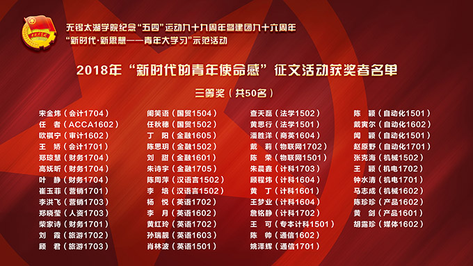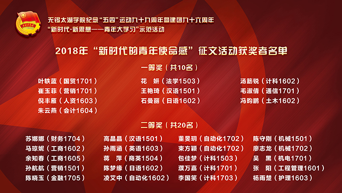 为引导best365各级团学组织和广大团员青年以“五四运动”九十九周年为契机积极学习“五四”精神,校团委于四月广泛开展了以“新时代的青年使命感”为主题的征文活动。活动中,各二级学院高度重视,精心组织,广大团员青年积极参与、踊跃投稿,截止至活动结束,共收到征文400余篇。经征文评审小组评审,评选出一等奖10篇、二等奖20篇、三等奖50篇,并对投稿多、质量好的组织授予优秀组织奖,现对获奖征文作者和获奖组织予以表彰。