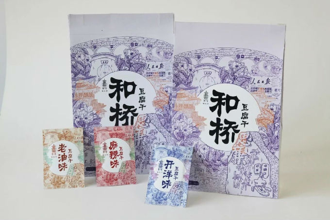 “慈圣和桥豆腐干”包装设计以“传承百年技艺,铭记古镇风华”为核心,围绕“和桥豆腐干”的历史底蕴,通过和桥遗迹、古街、镇花、东坡阁等地方元素宣扬和桥文化,更是将当年支援抗美援朝十万斤豆腐干的人民日报报道作为元素融入设计,赋予品牌“家国同源”的精神内涵,彰显老字号与时俱进的社会担当。