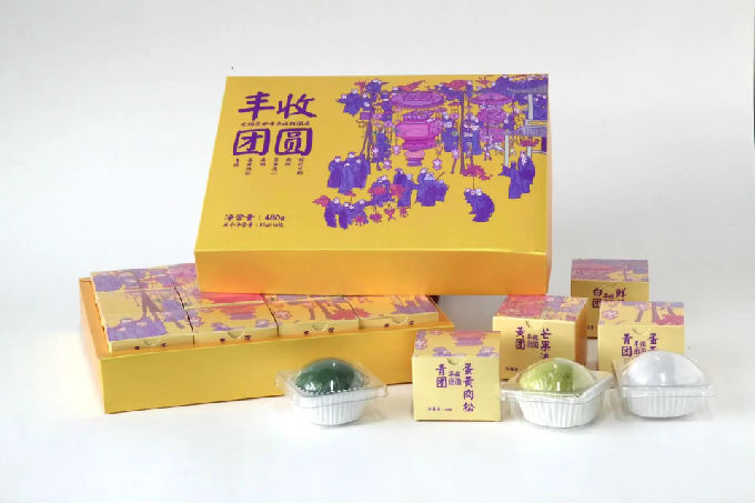 “丰收团圆”糕团包装设计作品,从旧时年末举行大型花灯庆丰收的画面与品牌内涵进行对接,再现运河无锡国泰民安的欢乐景象,伴手礼采用天地盖结构,便于拿取方便消费,小盒画面处理成淡雅的视觉效果,表现江南景色空蒙的地域意境。