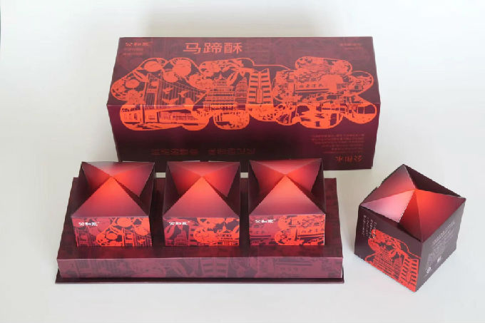 江阴“公和永”老字号马蹄酥包装设计,以“公和永”字形为图形来源,通过剪纸将江阴市花、地标建筑、特色美食融入其中,内包装翻盖的造型似清兵帽形,配合文案讲述江阴人民抗击清军斩落马蹄的品牌故事,暗红与桔红的明暗渐变进一步渲染了产品文化。