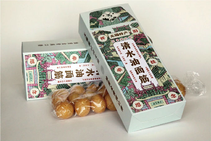 “松鹤”清水油面筋包装设计作品,着眼于传播古镇文化,视觉上采用惠山古镇九章翠峰、祠堂群、古戏台、惠山寺等独有的建筑,借鉴桃花坞木版画的形式,体现无锡运河古韵和两千多年来的繁华,传递老字号产品中怀旧、思乡的情感共鸣。