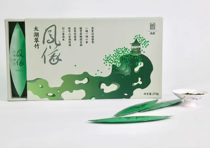 无锡老字号“风仪”牌太湖翠竹包装以寄畅园林文化为基点,用抽象概括的手法,将太湖石所形成的八音涧以及休闲亭,置于幽雅闲静的文化场境之中,内包装采用竹叶的造型,取翠竹之意,包装尽显文人气息,充满江南意境之美。
