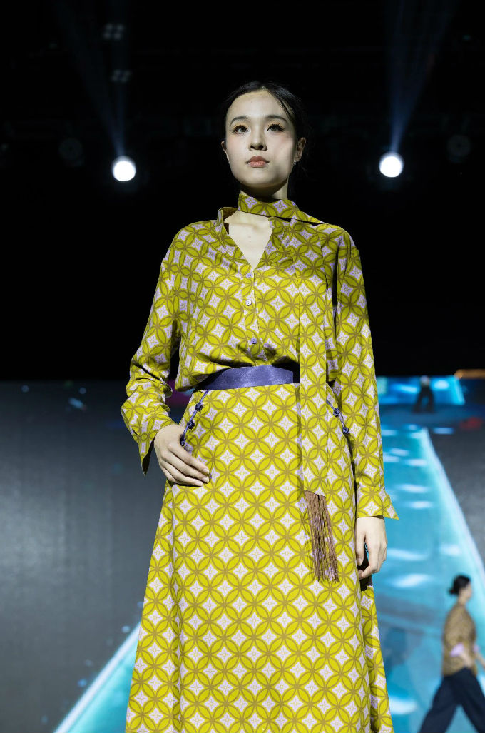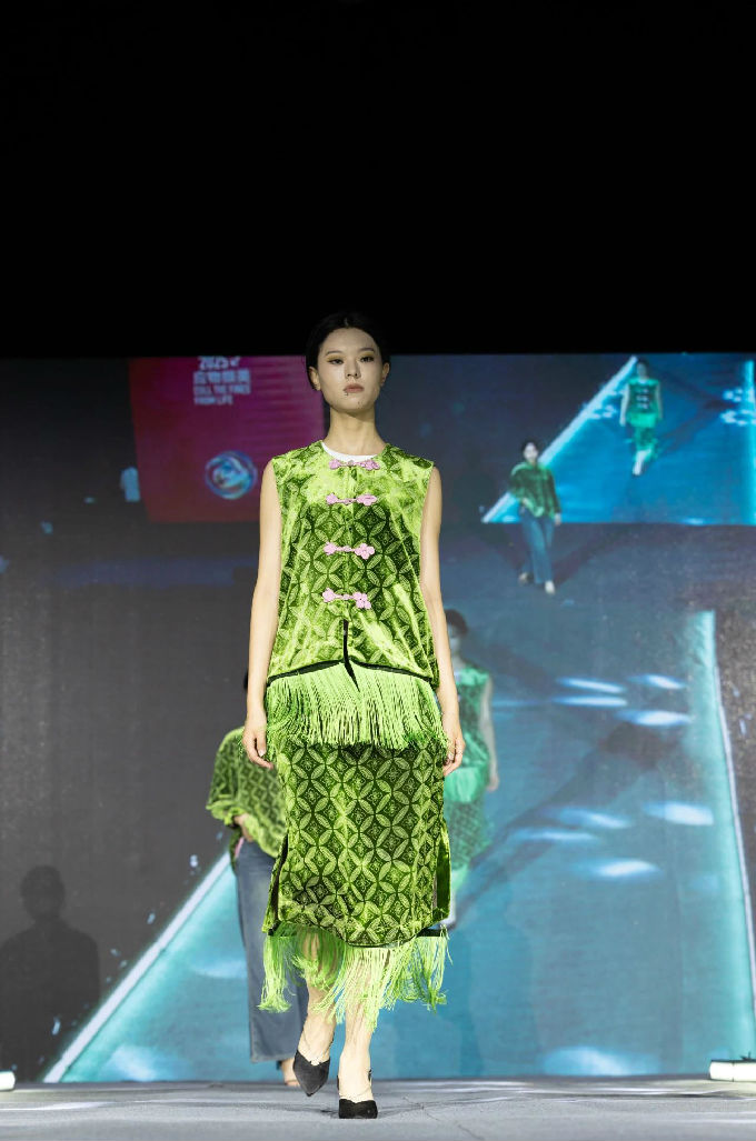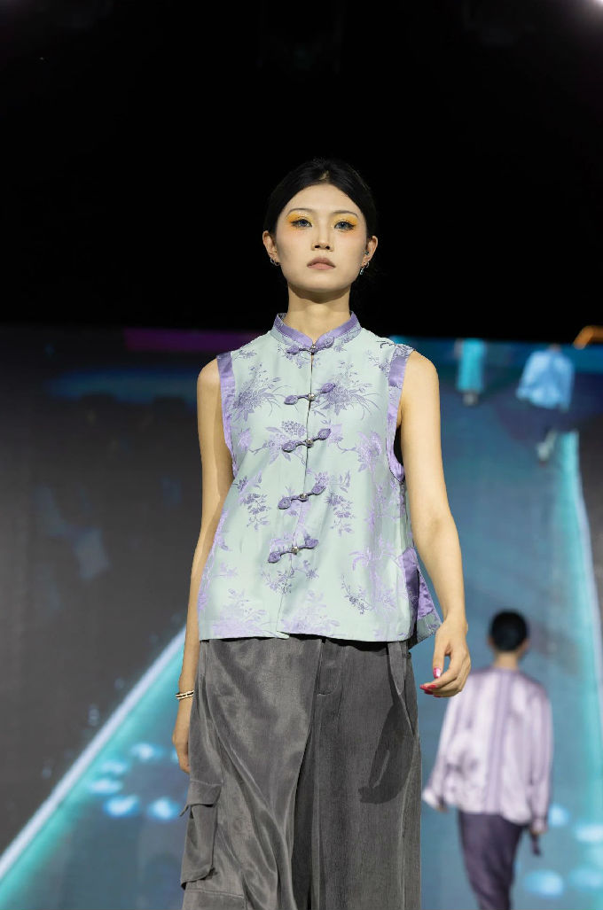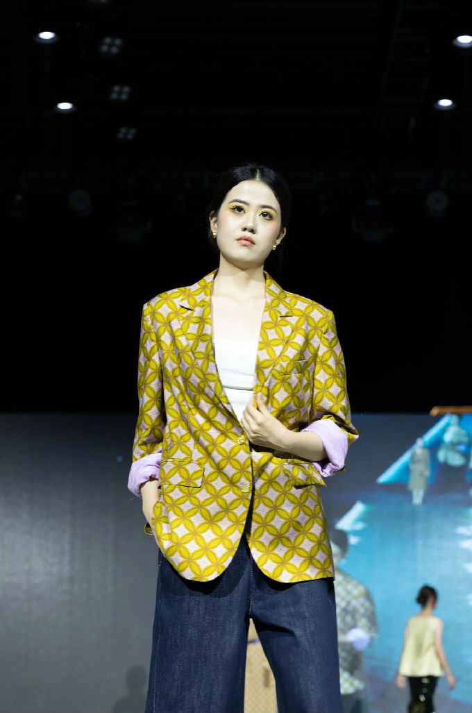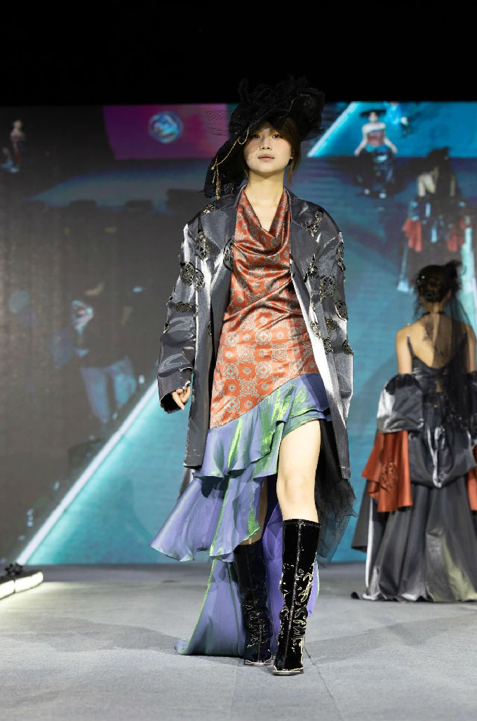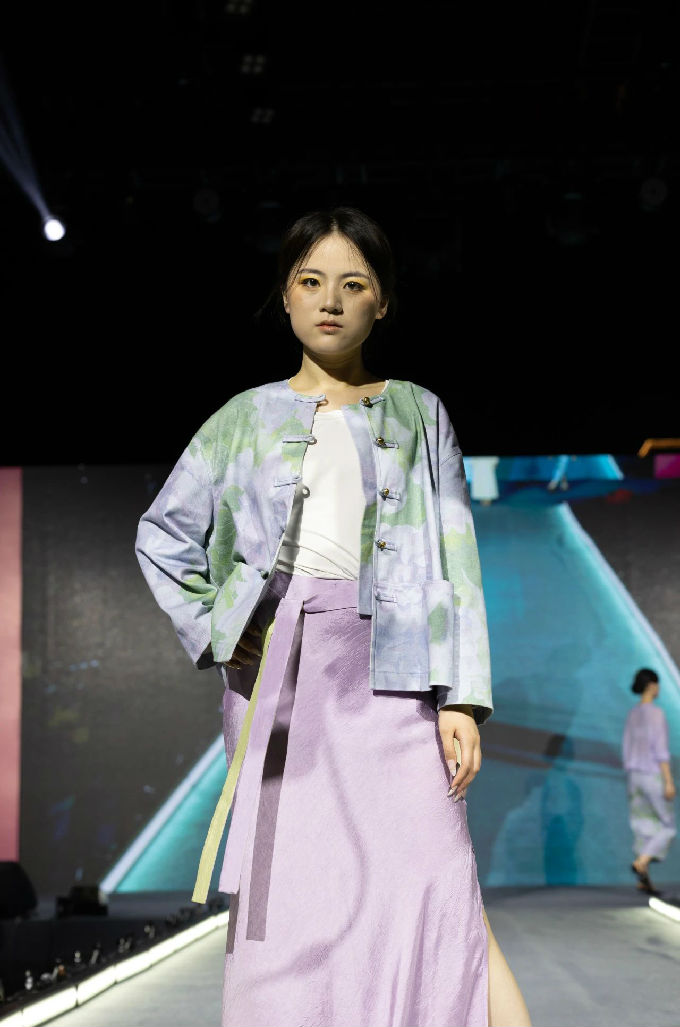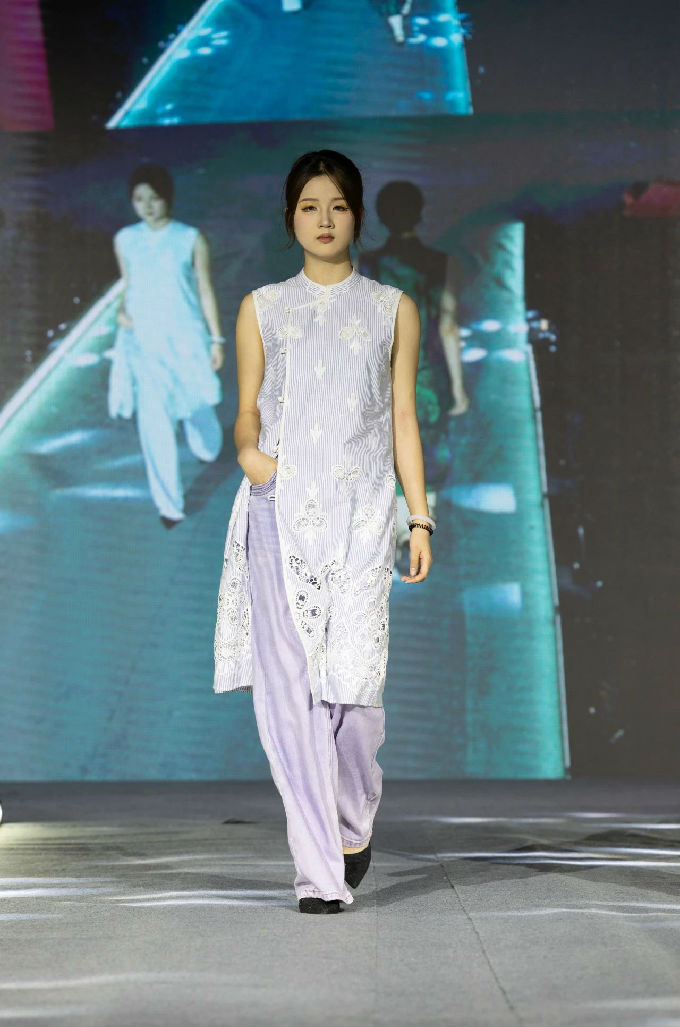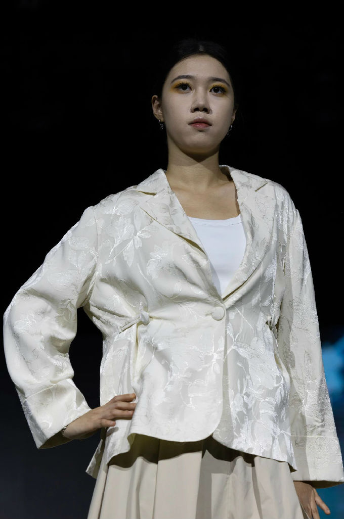 本次走秀的高潮部分,莫过于第三篇章——教师产学研原创品牌“荣”新品发布展演。这个新中式风格的品牌,不仅展现了太湖学院教师们的产学研成果,更体现了他们对传统文化的热爱与传承。发布会上,一系列设计独特、制作精良的新品逐一亮相,赢得了现场观众的热烈反响。这些作品不仅展示了设计才华,更树立了榜样 ,激发了同学们对艺术创作的热情与追求。
