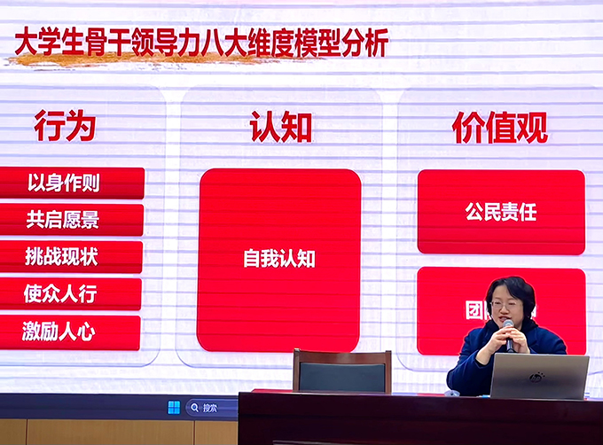 讲座伊始,胡书记着重强调了大学生骨干领导力提升的时代意义。她指出,学生骨干既是学生群体中的一员,也是学校与学生之间沟通的桥梁与纽带,学生干部应在服务同学的同时,积极协助学校开展各项工作,发挥桥梁、服务和带头作用。接下来,胡书记围绕大学生骨干领导力提升的内容研究进行了深入剖析,她分别从学生领导力的行为维度、认知维度以及价值观维度进行了讲解。