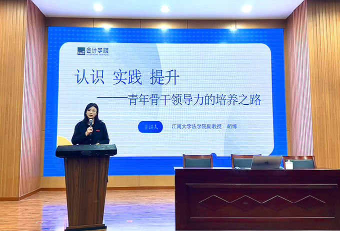 为提升学生骨干的综合素养,锻炼和塑造一支成绩优、作风好、能力强的学生干部队伍,12月3日晚,会计学院在大学生活动中心A一楼报告厅开展会计大讲堂专题讲座——认知、实践、提升:青年学生骨干领导力的培养之路。本次讲座由会计学院学工秘书陈婕主持,江南大学法学院党委副书记、副院长胡博副教授主讲。
