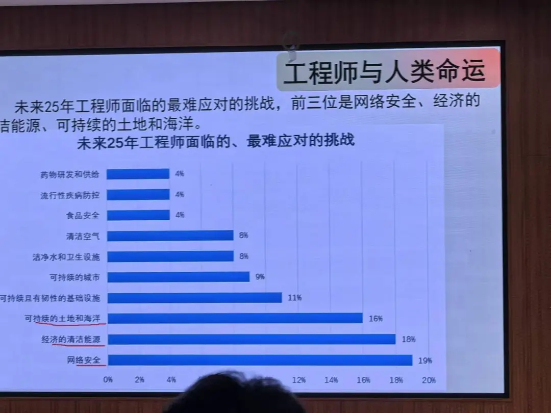 在谈到人类面临的挑战时,袁教授列举了自然资源枯竭、环境退化、气候变化等全球性问题,并展示了可持续发展的17个目标。特别指出未来25年工程师将面临的前三位挑战:网络安全,经济的清洁能源和可持续土地海洋。由于全球层面存在政府支持不足、缺乏关键技术、跨学科协作和国际合作等制约,限制了工程界解决这些挑战。面对挑战,全世界需要加速全球转型,实现可持续发展,而工程师更是责无旁贷。
