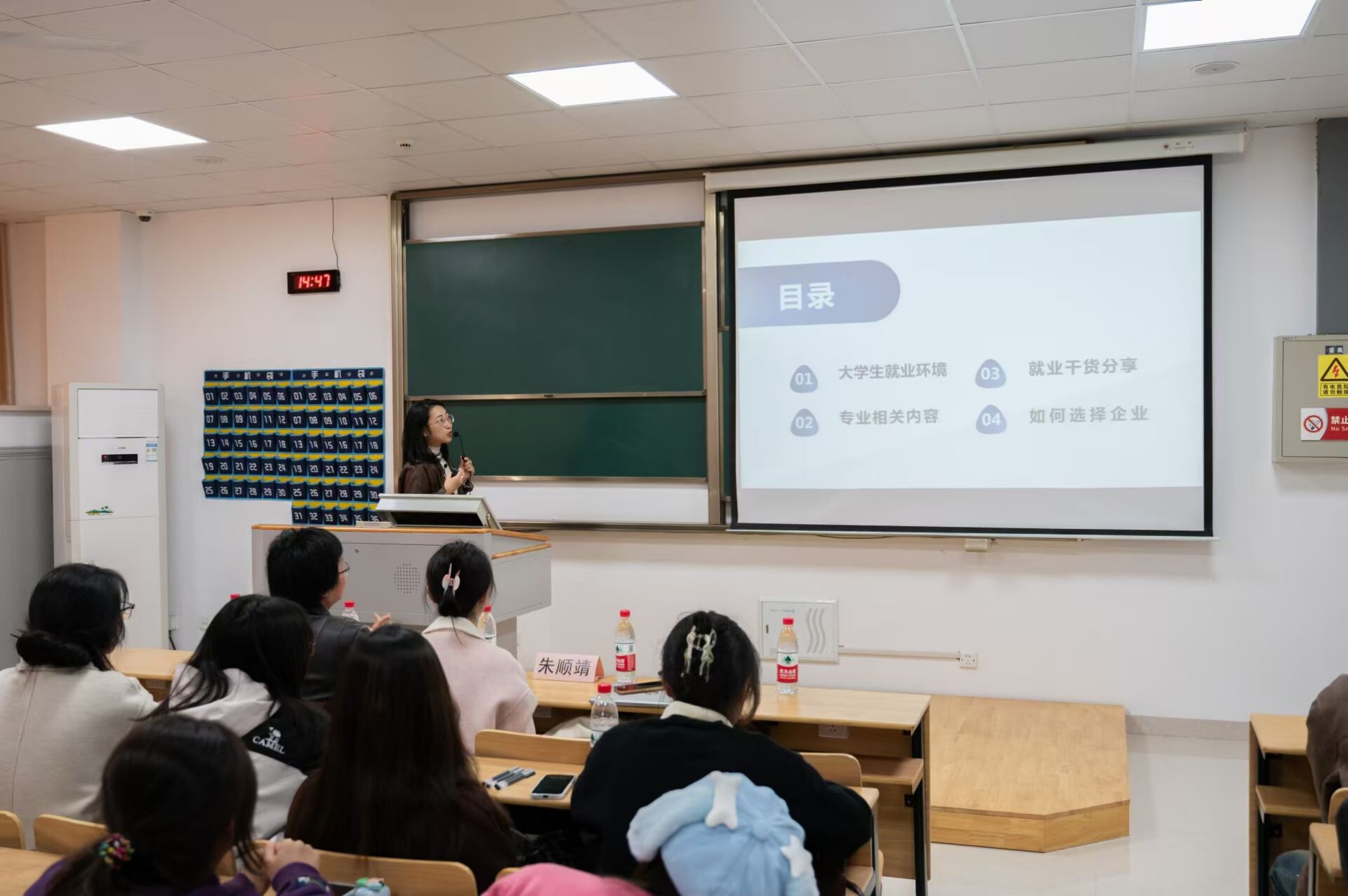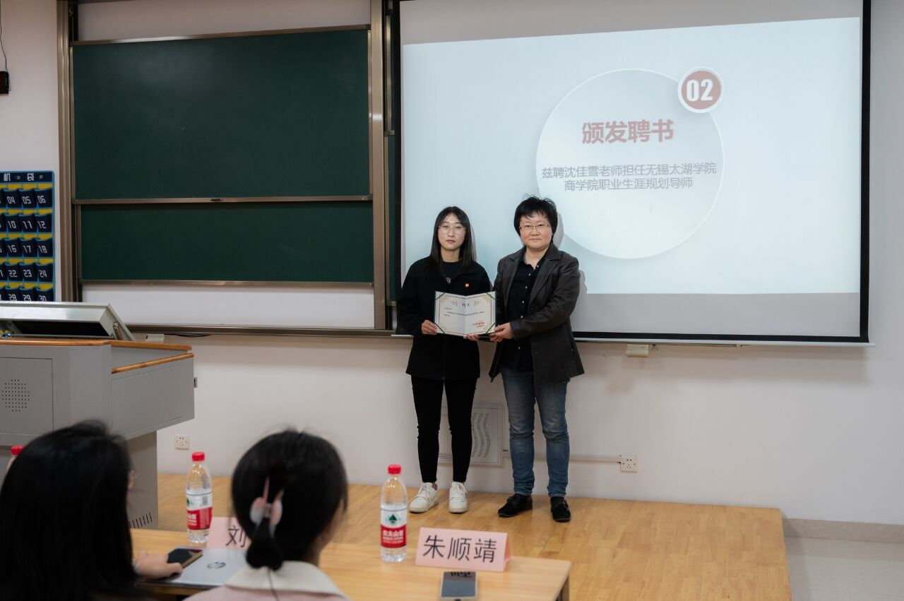 此次活动分为五个阶段,分别是优秀校友分享求职经历、颁发聘书、发放奖品仪式、卡思优派大学生就业指南指导以及院长助理讲话。活动伊始,由2018级优秀校友代表沈佳雪分享她的求职经历,作为小米汽车无锡市的销冠,她在与同学们分享的过程中,强调了“试错”二字,同学们深刻理解了人生具有无穷的可能性,我们要敢于尝试,敢于试错。