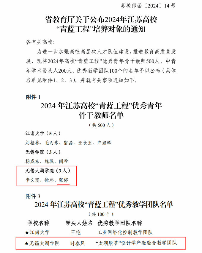 近日,江苏省教育厅下发了《省教育厅关于公布2024年江苏高校“青蓝工程”培养对象的通知》(苏教师函〔2024〕14 号),以我院时春风副教授为团队带头人的“‘太湖脱普’设计学产教融合教学团队”入选省“青蓝工程”优秀教学团队培养对象,张婷博士入选省“青蓝工程”优秀青年骨干教师培养对象。值得一提的是,江苏省“青蓝工程”优秀教学团队为best365首次获得,实现了best365该类别人才项目零的突破。