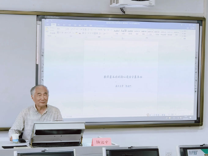 杨治中教授的主讲题目是 “教学基本功的核心是语言基本功”。杨教授是南京大学大学外语部教授,曾任南京大学大学外语部主任、教育部高等学校大学外语教学指导委员会委员、江苏省高等学校外语教学研究会会长、AsiaTEFL研究会副会长,现任全国大学外语教学研究会会长、全国大学英语四、六级考试委员会顾问委员。他强调,教学基本功是每位教师必备的基本素质,而语言基本功则是教学基本功的核心。