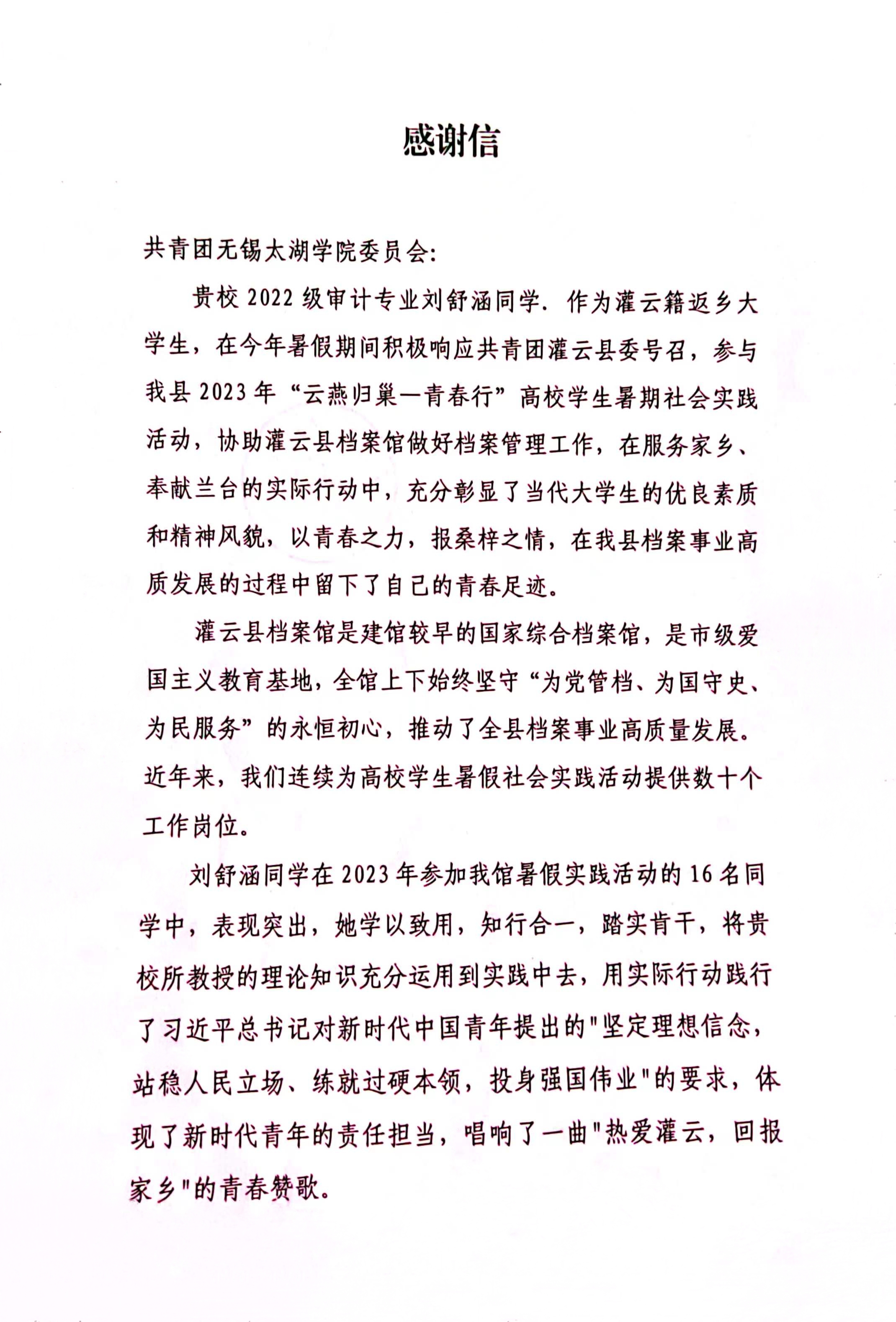 2023年7月,审计2202刘舒涵同学参加“云雁归巢-兰台行”暑假实践活动,前往灌云县档案馆进行为期一个月的实习。活动结束后,我院收到了来自灌云县档案馆的感谢信,信中多次赞扬了刘舒涵同学暑期在档案馆中的优秀表现。因此,本次采访邀请到了刘舒涵同学参加。