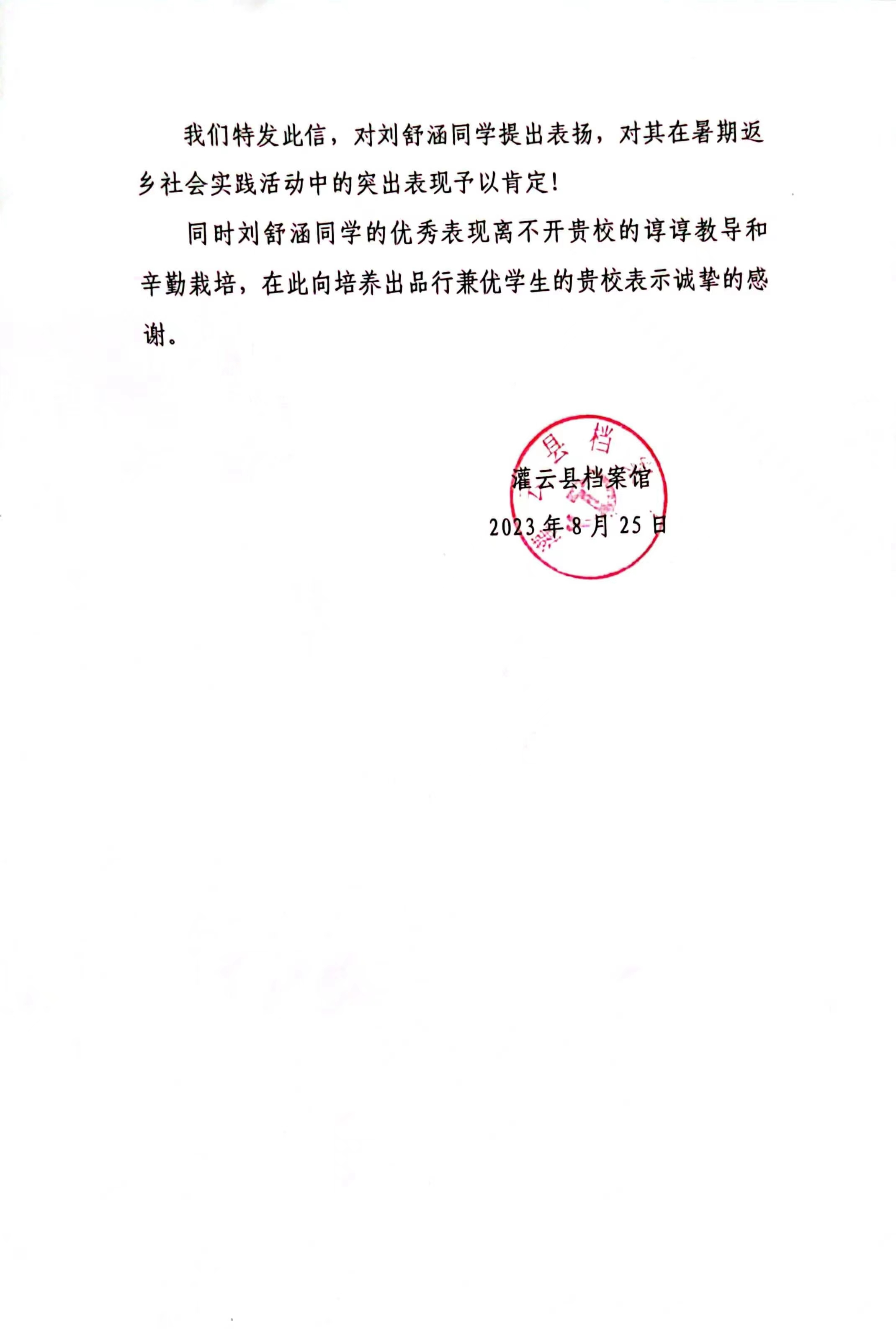 刘舒涵同学作为土生土长的灌云人,主动了解灌云县的发展情况,通过面试,获得了“云燕归巢——青春行”暑假实践的机会,开启了一段全新的实习之旅。她表示在学校期间学习了丰富的专业知识,但我们的实践经验缺乏,而档案馆为她提供了展现自我与检验自我的机会,是直观高效了解机关事业单位工作的大好平台。