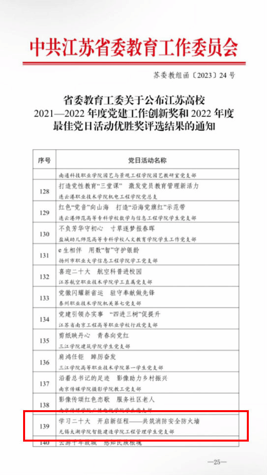近日,中共江苏省委教育工委公布了江苏省高校2022年度“最佳党日活动”优胜奖评选结果,我院党总支工程管理学生党支部申报的《学习二十大,开启新征程—共筑消防安全防火墙》荣获2022年度江苏省高校“最佳党日活动”优胜奖。