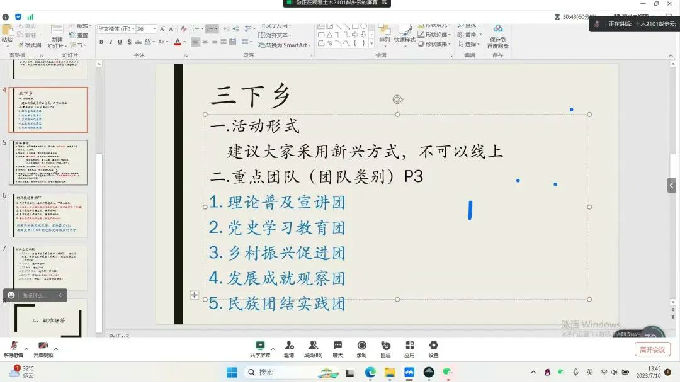 大会伊始,彭步云同学针对此次会议的第一部分进行讲解,向同学们说明三下乡的活动意义和活动形式,以及三下乡活动的重要性。向同学们介绍了三下乡活动可以从文化、科技、卫生几个主题入手,是各高校在暑期开展的一项社会实践活动,同时特别强调了今年的三下乡活动建议采用兴新方式,避免以线上的形式进行。活动内容一定要真实有效,具有可行性。