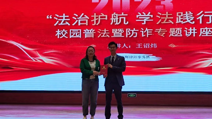 讲座开始前,智能建造学院学生党支部书记王莺老师为主讲人王诏炜律师颁发“校园法治辅导员”聘书。随后由主持人宣布讲座开始,王律师上台正式开启普法反诈演讲。