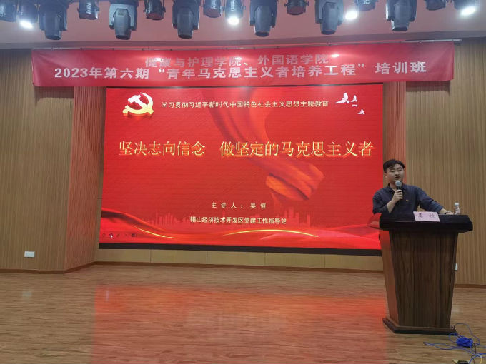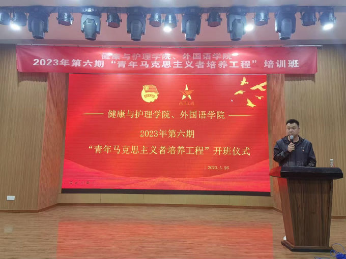 以“坚决志向信念,做坚定的马克思主义者”为培训目标,指导新时代青年爱国爱党,矢志不渝地追随马克思主义的步伐,健康与护理学院与外国语学院于5月26日下午在大学生活动中心A举行了青马工程开班仪式及第一课。此次仪式由外国语学院姚靓雯老师主持,出席本次活动的领导有外国语学院党总支副书记俞昊波、健康与护理学院团总支书记马晓星,此次讲座特邀锡山经济技术开发区党建工作指导站副站长吴恒作为主讲人。