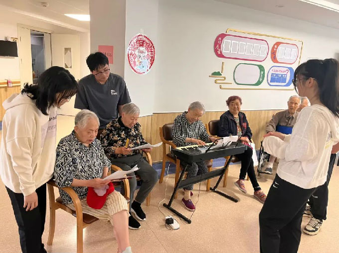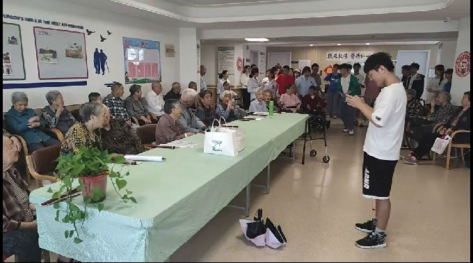 活动分为两个阶段。第一阶段为“互动表演”,王思源同学作为“歌唱组”代表率先为老人们演唱,随后“歌唱组”一一上台表演,伴随着同学们的歌声,老人们渐渐也和着节拍,为同学们鼓起掌声,看到这样的情景作为志愿者的我们发自内心感到高兴,能够给老人们的生活带去欢声笑语,也让我们心中爱的种子生根发芽。随后老年“歌唱组”弹琴合唱,爷爷奶奶们满怀激情地演唱了几首富有爱国情怀的歌曲,他们大多数头发斑白,高龄近九十,生于上世纪战争年代,爱国早已刻进骨子里。作为志愿者的我们深受教育,铭记于心。