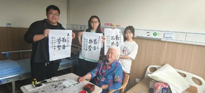 学工助理团“陪聊组”针对的是一些喜欢读书看报的老人,是作为他们的倾听者,为他们解闷排忧。他们也非常乐意分享他们的年轻趣事,读书体会,和作为过来人的忠告,“陪聊组”时常传出欢声笑语。还有的老人愿意一展书法风采,并将书法作品赠与同学。
