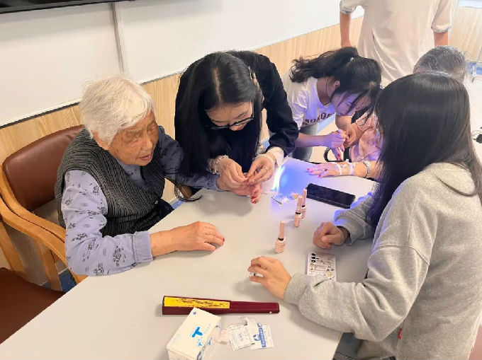 活动第二阶段,学工助理团“美甲组”用自带的美甲工具给有爱美之心的奶奶们制作了精美的美甲,她们大多一生操劳,年轻时或许没能有机会好好装扮一番,在双手在涂上指甲油的时候许多奶奶露出了开心的笑容,并对这种新颖的美化方式感到好奇。“美甲组”的成员们也挨间探访,为行动不便的奶奶也做上了好看的美甲。